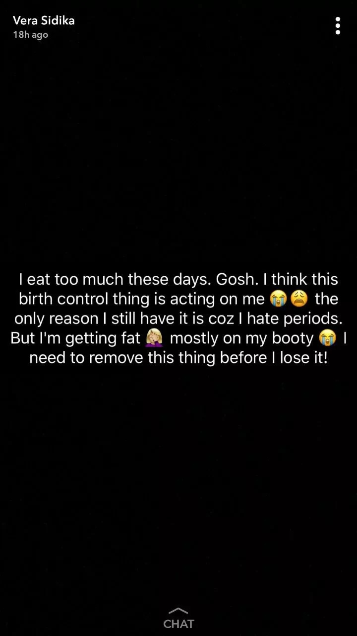 A screenshot of Vera Sidika complaining about the effects of the birth implants she is using. Photo: Vera Sidika/Snap Chat