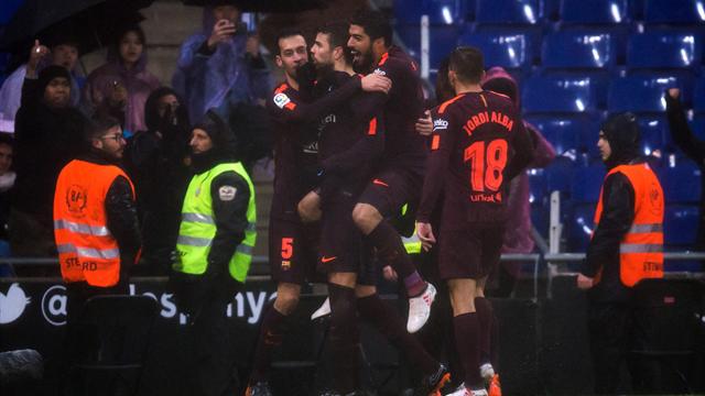At a waterlogged, rain-swept RCDE Stadium on Sunday they looked like suffering the same fate again but dug deep in the mud to muster a late equaliser, headed home by a gleeful Gerard Pique to level the scores at 1-1.